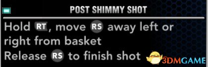 晃肩投篮:按住RT,右摇杆推住远离篮筐方向的左边或者右边,松开完成投篮.