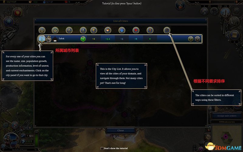 你可以根据需要选用食物、法力、金钱、民众满意度等条件对城市进行排序。