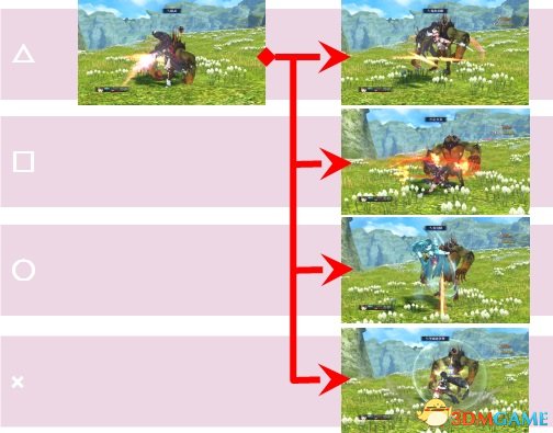 用 口×△○四个按钮来自由设置术技,不用考虑术技的种类和顺序等,按照自己喜欢的连段去设计。